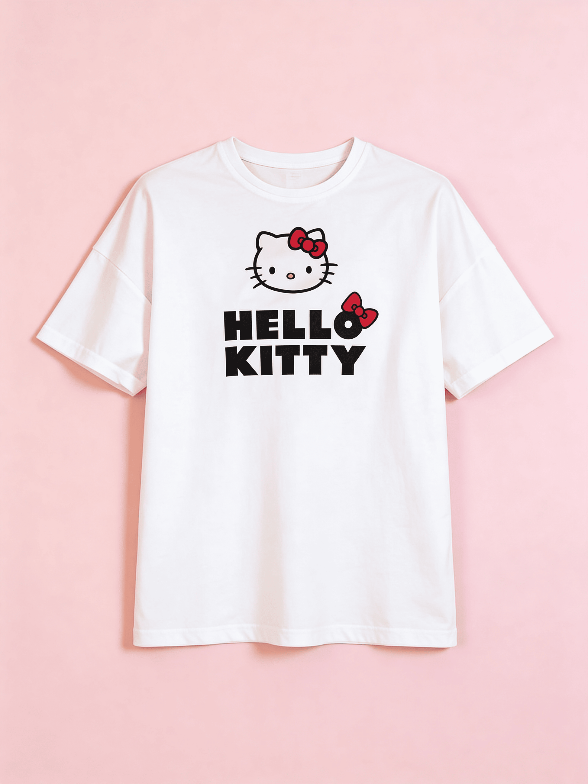 White Hello Kitty t-shirt with a prominent print of the beloved cat and logo. The universal loose fit is suitable for everyday outfits as well as home comfort. The quality material ensures pleasant wear, and the modern design with the iconic bow makes the t-shirt a standout piece in your wardrobe. Ideal for all Hello Kitty fans and kawaii style enthusiasts.